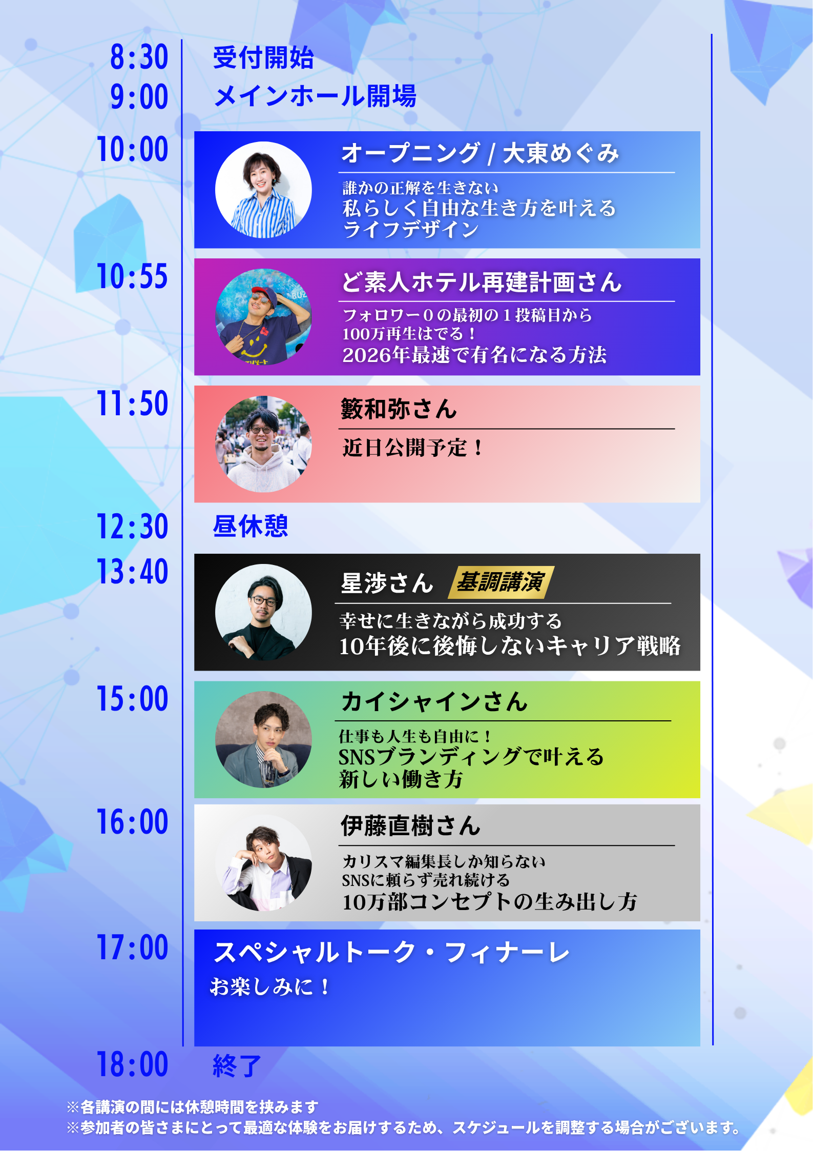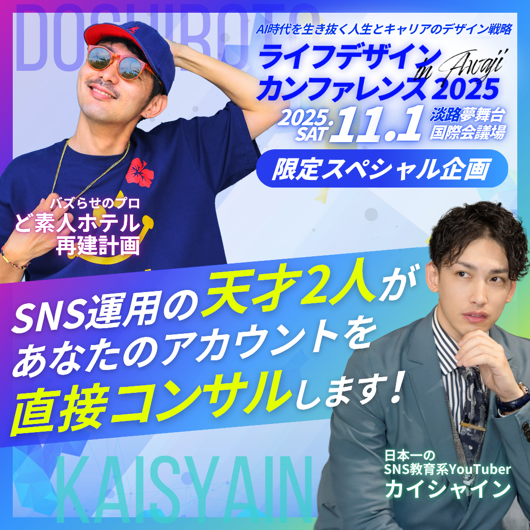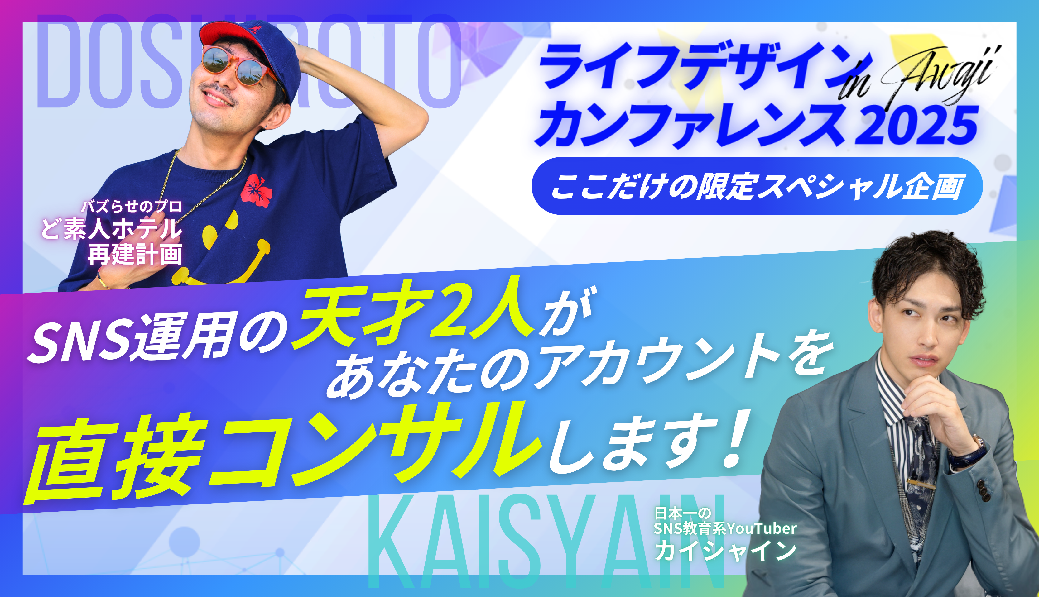 このライフデザインカンファレンス主催の大東めぐみは、SNSを活用した日本の地方創生に今まさに挑戦しているところです。 大東は淡路島出身で、地元淡路島の魅力をSNSマーケティングで広め、地方の活性化につなげたいという熱い思いで活動に取り組んでいます。2025年夏、その思いが現実のものとなり、廃墟となったホテルを再生して淡路島屈指のオーベルジュとして生まれ変わらせました。この挑戦が日本全国に広がることで、私たちの国全体がより魅力的で活気に満ちた場所になると信じ、日々最前線で活動を続けています。