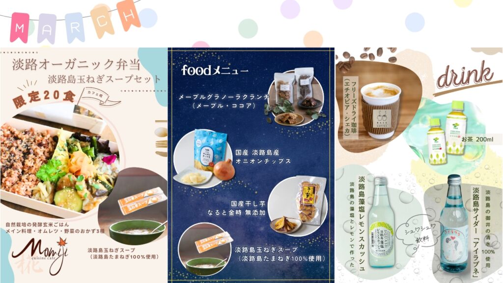 出店内容 : 淡路特産品(サイダー・玉ねぎスープ)、フリーズドライコーヒー、カフェ椛のお弁当&グラノーラクランチなど